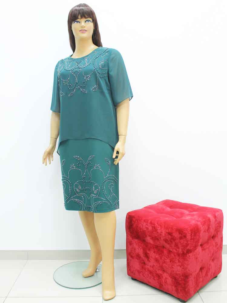 Также это платье есть в зеленом цвете, код 110423 в двух размерах. Размер 44 (европейский) с обхватом по груди - 116 и обхватом по бедру - 124 см. Размер 48 (европейский) с обхватом по груди - 126 см и обхватом по бедру - 136 см.